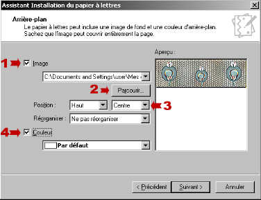 ![]() 1. Cocher la case Image. 2. Cliquer ensuite sur Parcourir. 3. Mettre Centre dans cette case. 4. Cocher la case Couleur Cliquer sur Suivant. Choisir la police, la taille et la couleur désirée, selon votre papier à lettres. Cliquer sur Suivant. |