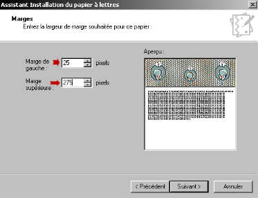 ![]() Selon votre image, il vous faudra bouger la marge de gauche et la marge supérieure. Pour ce faire, cliquez sur les petites flèches et vérifiez l'aperçu. Cliquez sur Suivant. Nommer votre papier. En principe il faut garder le même nom que votre image qui a servi à faire le papier. Si votre image s'appelle papier_ange, il faut nommer votre papier, papier_ange. Cliquer sur Terminer. Cliquer deux fois sur votre papier qui est apparu dans la fenêtre. |